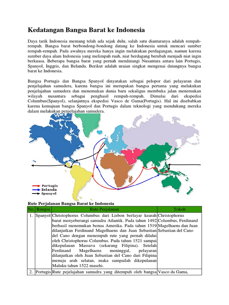 Datangnya bangsa barat ke indonesia tidak terjadi secara bersamaan. Gambar rute perjalanan bangsa barat ke indonesia : Rute perjalanan bangsa barat ke indonesia no bangsa. Rute kedatangan bangsa barat ke indonesia. Bangsa barat ingin melakukan ekspedisi ke indonesia namun hal tersebut masih terbatas terkendala transportasi. Rute perjalanan bangsa barat ke indonesia. Jalur masuknya bangsa barat ke indonesia dari bangsa yang pertama yaitu spanyol sampai pada jepang. Pada tahun 1486, bartolomeus diaz melakukan pelayaran pertama menyusuri pantai. Dari lisbon, portugis pada tahun 1486 bartolomeo diaz melakukan pelayaran pertama menyusuri pantai barat afrika. Knowledge rute kedatangan bangsa barat ke indonesia gambar jalur pelayaran bangsa barat ke indonesia adalah informasi penting disertai dengan foto dan gambar hd yang bersumber dari semua situs web di dunia. Kedatangan bangsa portugis di maluku dari lisbon, portugis pada tahun 1486 bartolomeo diaz melakukan pelayaran pertama menyusuri pantai barat afrika. Tujuan utama kedatangan bangsa barat ke indonesia. Jatuhnya konstantinopel ke tangan turki tahun 1453.